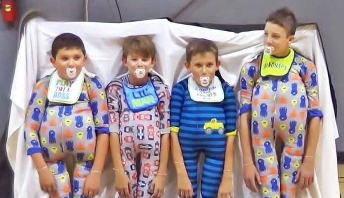 In 2017, a group of four fifth graders from New Braunfels Christian Academy in Texas presented a unique performance at the Elementary Talent Show. To keep their act a surprise, the students began by concealing themselves under a black cloth. When the fabric was finally removed, the audience was met with the sight of the boys wearing infant costumes, complete with small prosthetic legs that they manipulated with their arms. This unexpected sight elicited an immediate burst of laughter from the crowd, setting the stage for what was to come.