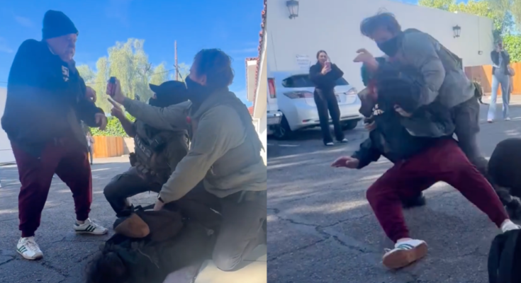 Two images from video taken of a man who was tackled and pepper sprayed Friday. (Video courtesy Lizzie Rodriguez/Special for the News-Press)