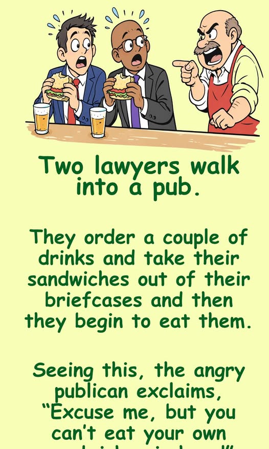 Seeing this, the angry publican exclaims, “Excuse me, but you can’t eat your own sandwiches in here!”